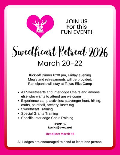 It's the annual meet-up of Sweetheart teams from our Texas Lodges. The main goal? Raising funds for the Sweetheart Program, There's a little something for everyone. We've got games that'll get your heart racing, prizes that'll make your eyes light up, and delicious food all weekend long. The big auction is a highlight, promising unique items up for bidding.